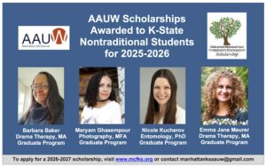 Four outstanding K-State nontraditional female graduate students were awarded AAUW scholarships for the 2025-2026 academic year. The AAUW scholarship program is administered each year through the Greater Manhattan Community Foundation (https://www.mcfks.org) and is funded by the local AAUW Manhattan Branch. The award recipients were Barbara Baker, MA student in drama therapy; Maryam Ghasempour, MFA student in photography; Nicole Kucherov, PhD student in entomology; and Emma Jane Mauer, MA student in drama therapy.